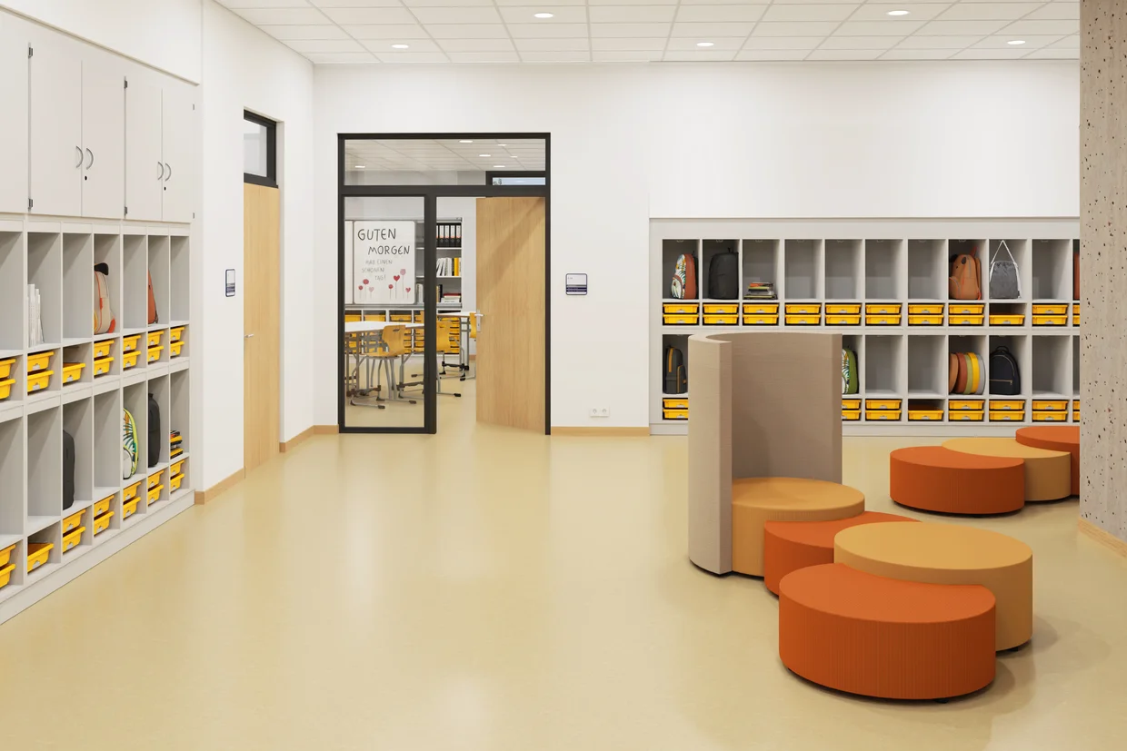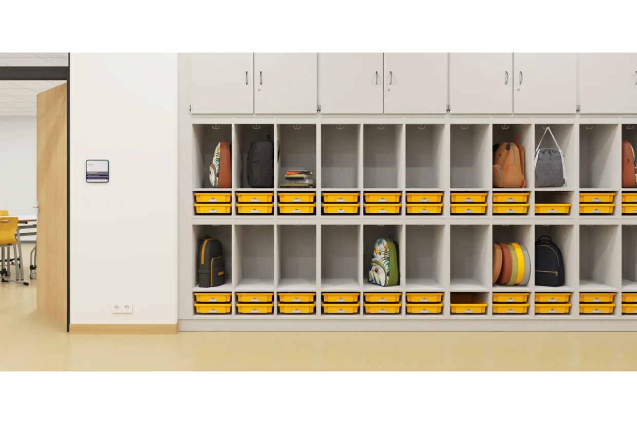 4032.641 Fatageymsla Snagarnir og geymsluboxin bjóða nemendum uppá þæginlega leið til að geyma öll þau útiföt sem þau nota dagsdaglega