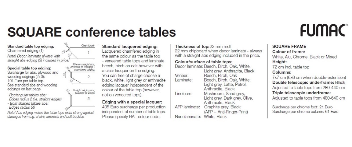 Fætur borðanna eru ferkanntaðiar súlufætur með rúnuðum hornum.