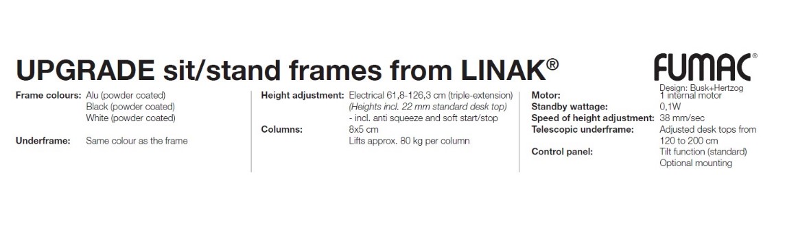 Upgrade rafmagnsborð eru með Linak mótorum, ferkönntuðum súlu fótum með rúnuðum hornum.